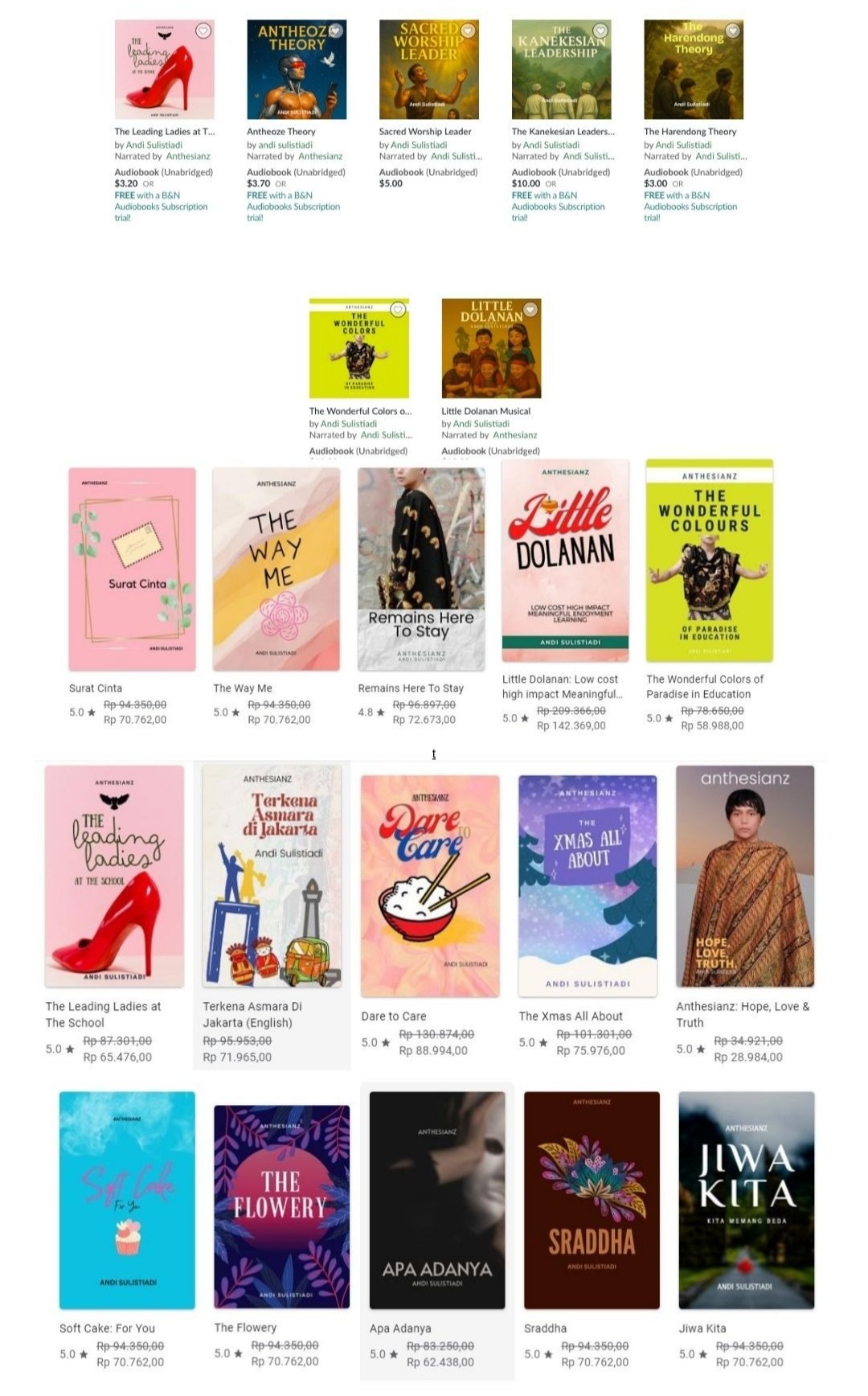 Anthesianz has released few books adorably. The most popular one is in 2022 "The Wonderful of Paradise in Education" and "Little Dolanan". In 2023 he wrote several books such as "The Way Me", "Flowery", "Jiwa Kita", and "Soft cake". He also wonderfully releases several books in 2024 such as "The Strategy to Increase teacher's performances", In 2025 such as "The Harendong Theory", "Antheoze Theory", "Sacred Worship Leader". "Nityarajya: Sacred Saga", and more.